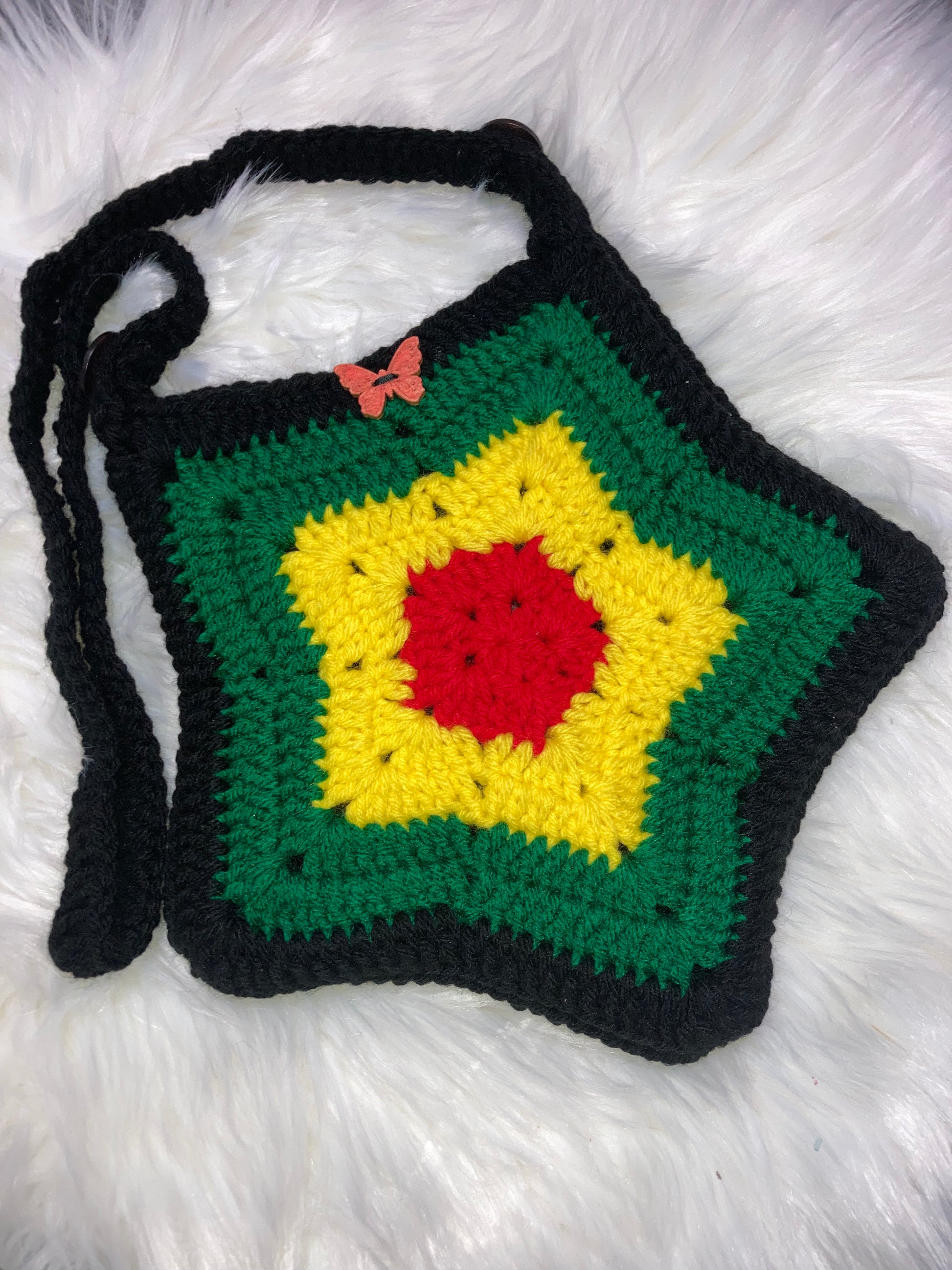 Crochet Star Purse with adjustable strap. Can be customized with colors as well as a name or quote.